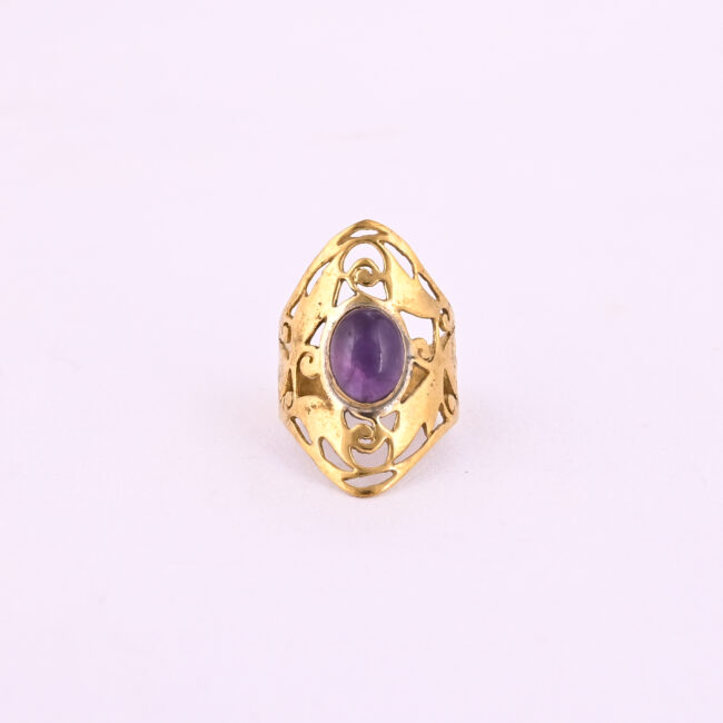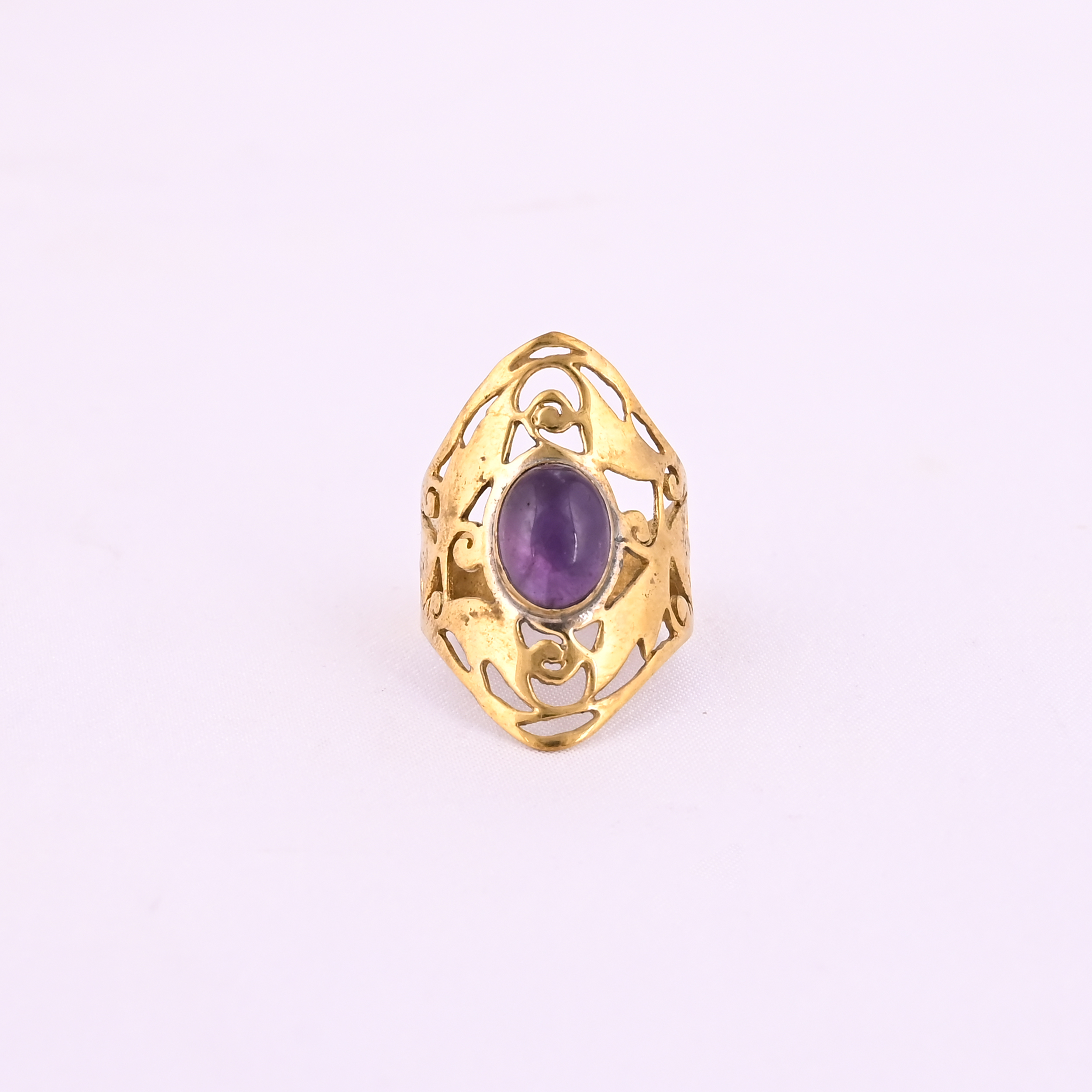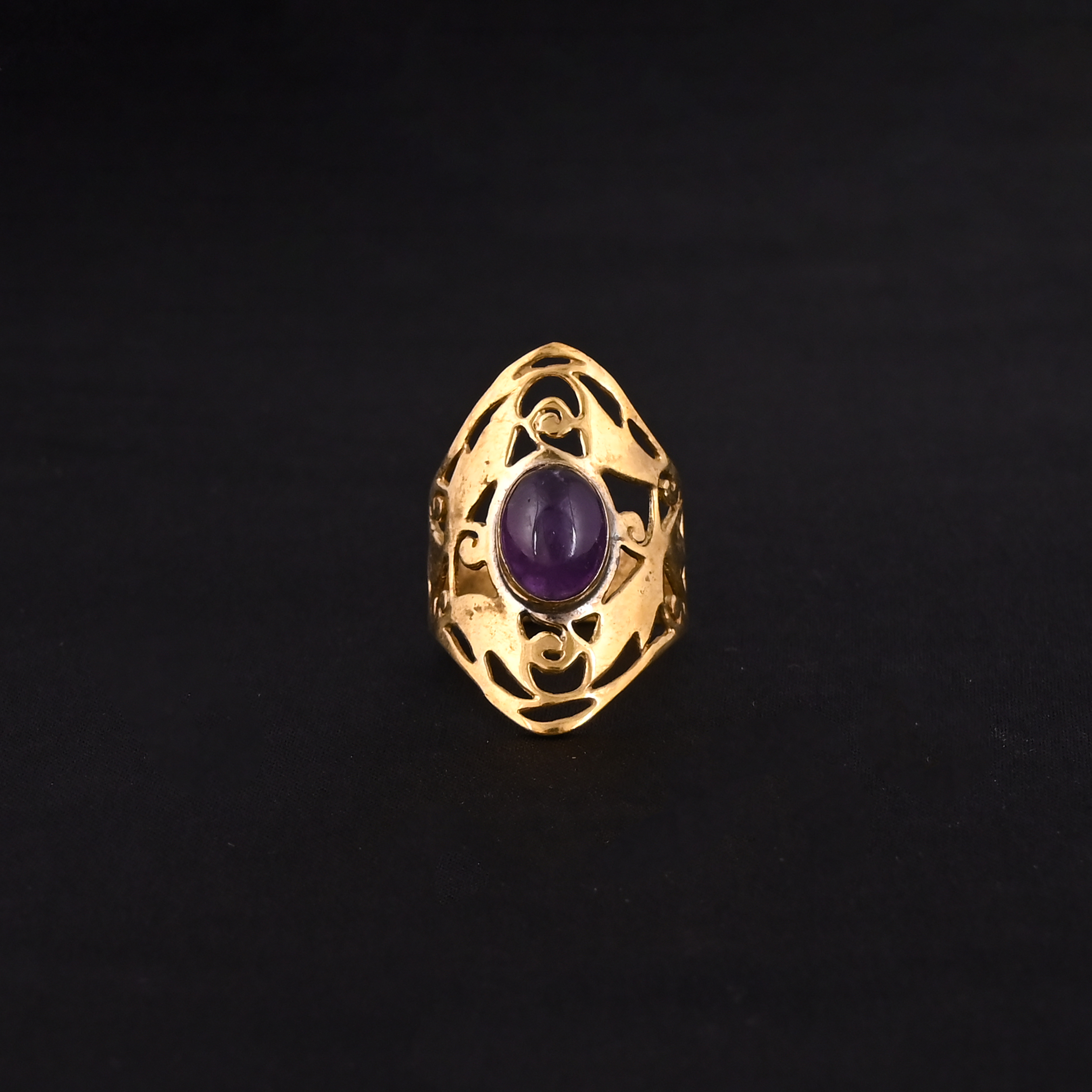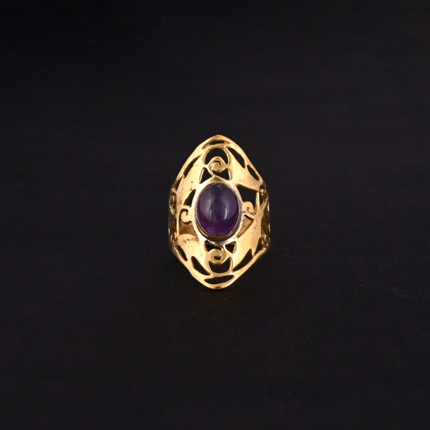 Amethyst Swirl Purple Stone Gold-Plated Ring-This striking vintage ring features a rich purple oval cabochon stone set in a unique gold-toned openwork band. The elongated hexagonal face and swirling filigree-style cutouts give the piece a bold, artistic flair, while the polished purple stone adds a pop of royal color. A standout accessory with an elegant, bohemian touch.