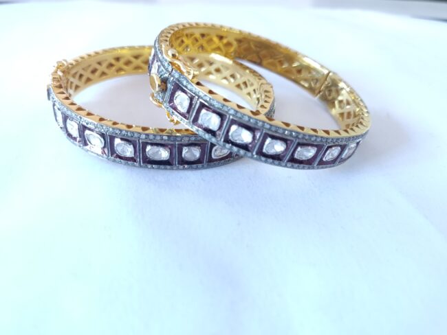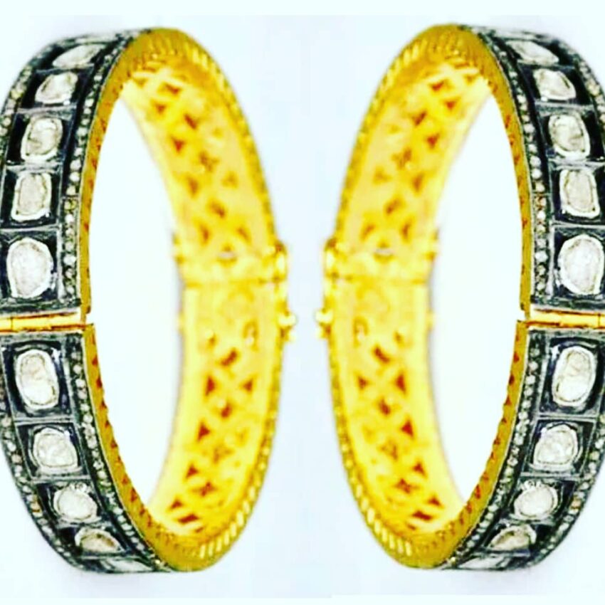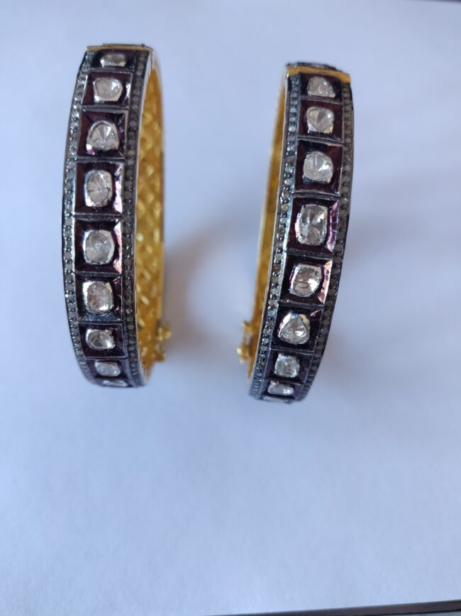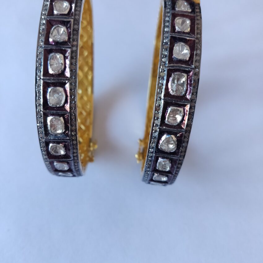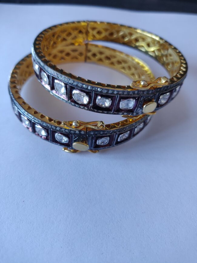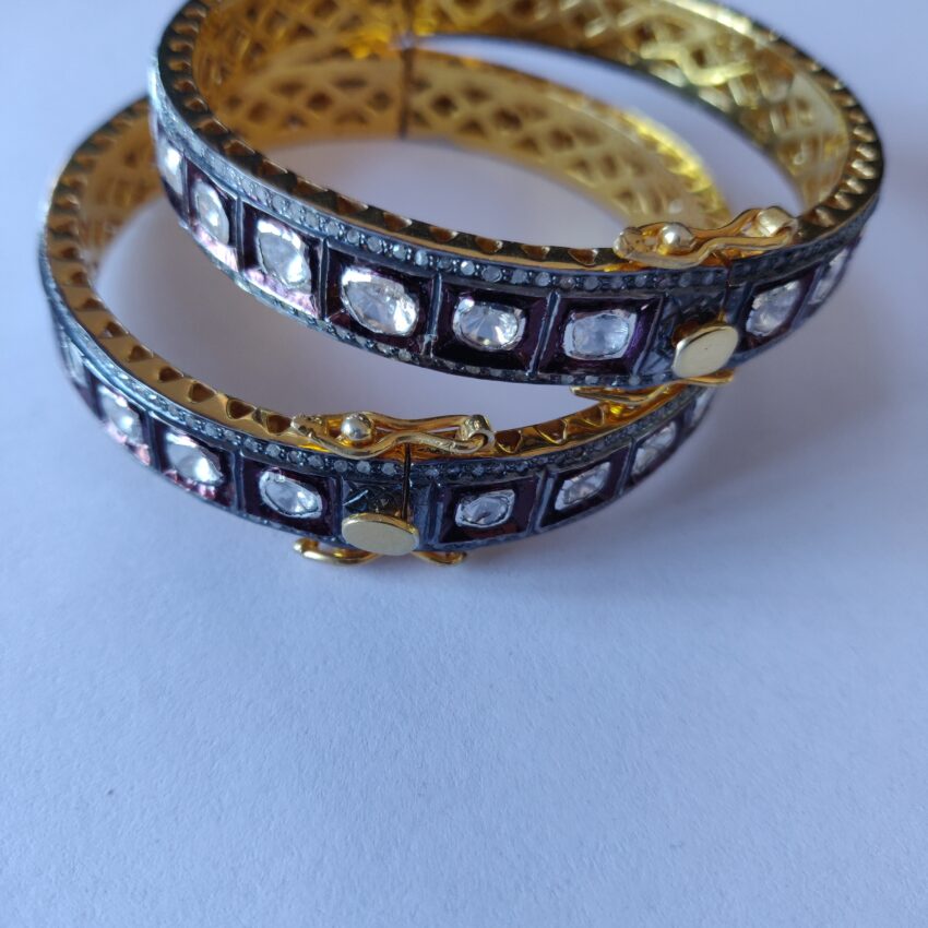 Elevate your traditional ensemble with this exquisite pair of antique-style bangles. Expertly crafted with a gold-plated base, these bangles feature an elegant geometric design encrusted with high-quality Polki-style stones, offering a luxurious sparkle that’s perfect for weddings, festivals, or special occasions. The intricate detailing and dual-tone finish — blending deep oxidized accents with bright golden interiors — add a regal touch, making them a standout addition to any jewelry collection.