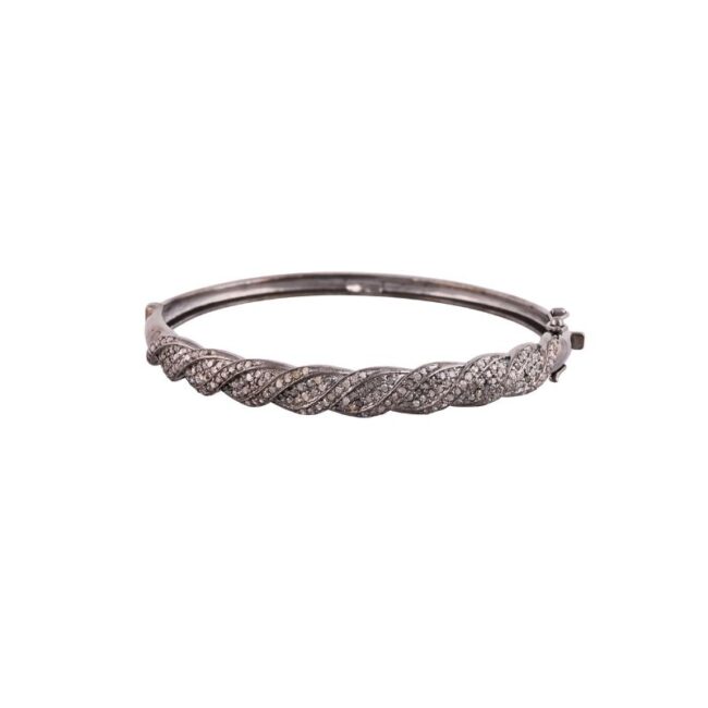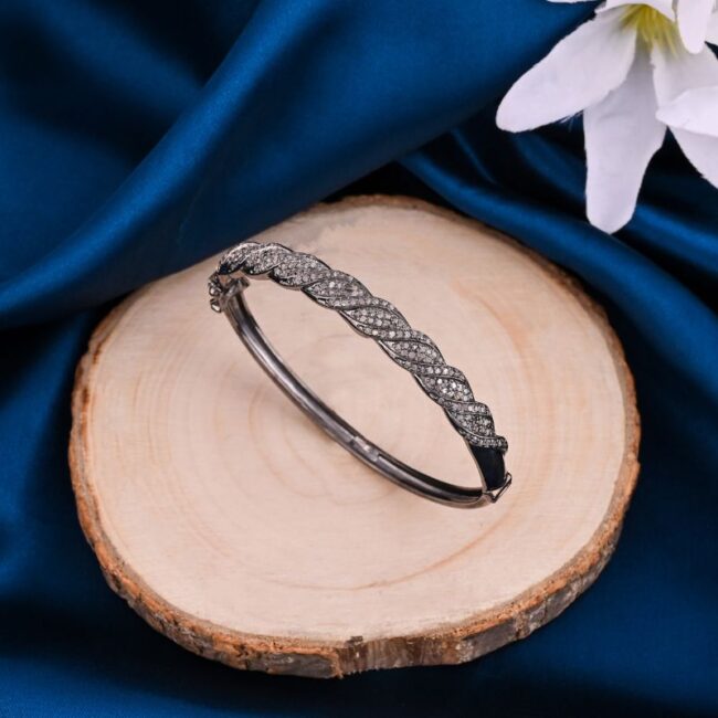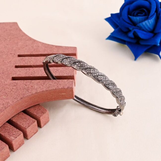 Plated Bracelet showcases a captivating twisted design, adding a touch of modern elegance to any outfit. The intricate detailing of the twisted band creates a visually striking and dynamic effect. The set securely within the twists, add a touch of luxury and sophistication. The contrast between the dark metal and the sparkling stones creates a captivating and eye-catching aesthetic.