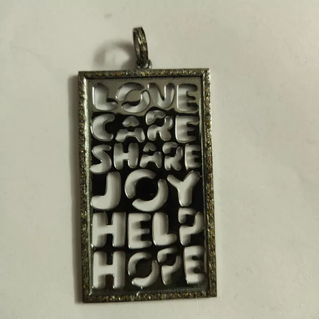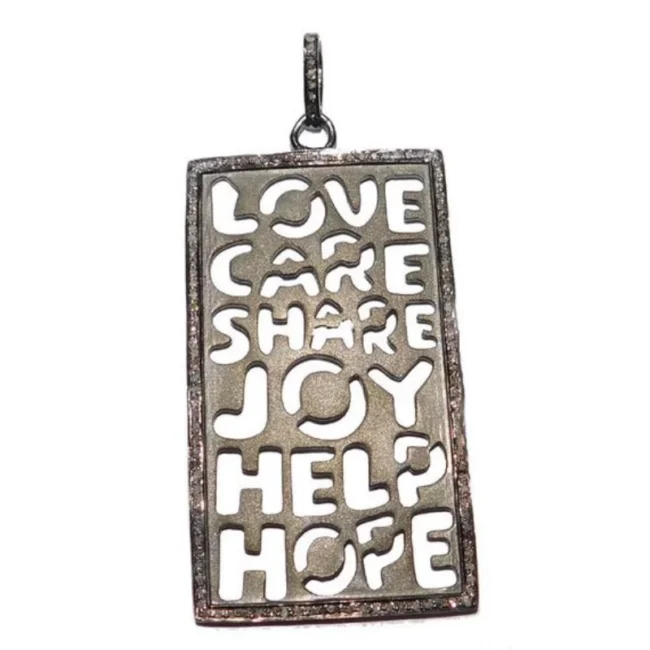 This exquisite diamond pendant is more than just a piece of jewelry; it’s a wearable reminder of positive values. The pendant showcases the words “LOVE, CARE, SHARE, JOY, HELP, HOPE” cut out, creating a unique and meaningful design. Each letter is adorned with sparkling diamonds, adding a touch of glamour and elegance.