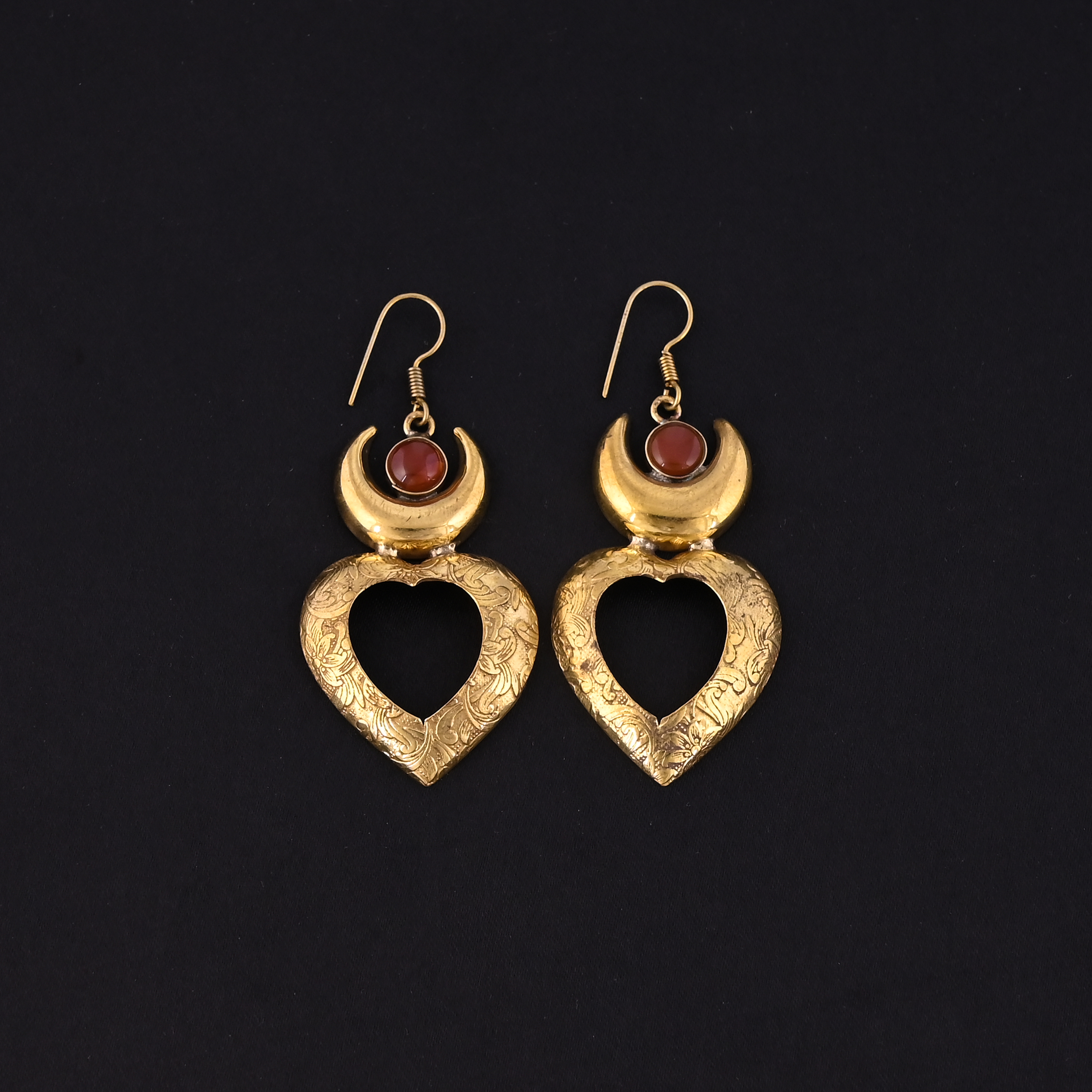 Moon & Heart Drop Earrings with Red Gemstone