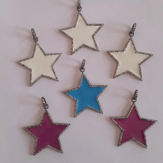 This set of five starburst pendants is a celebration of color and sparkle. Each pendant features a bold starburst design filled with vibrant enamel in a range of colors (including white, blue, and pink) and accented by a halo of shimmering diamonds. The combination of the bold colors, sparkling diamonds, and geometric shapes creates a truly unique and eye-catching collection. This set is perfect for those who love to express their individuality and add a touch of playful sophistication to their style.