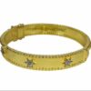 This elegant gold bangle features a minimalist design with a row of sparkling diamond-studded circles, adding a touch of glamour and sophistication. The sleek silhouette and clean lines make it a versatile piece that can be dressed up or down. Perfect for any occasion, whether it’s a special celebration or everyday wear, this bangle is sure to impress.
