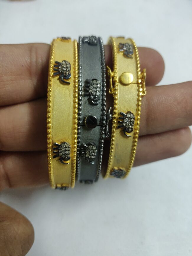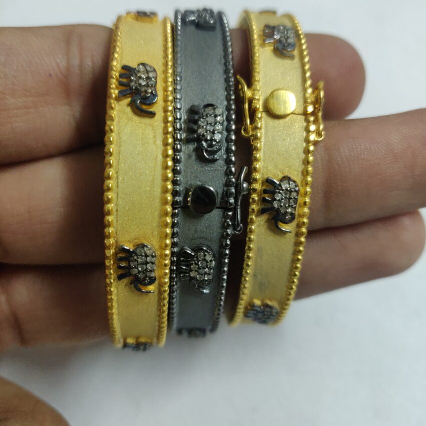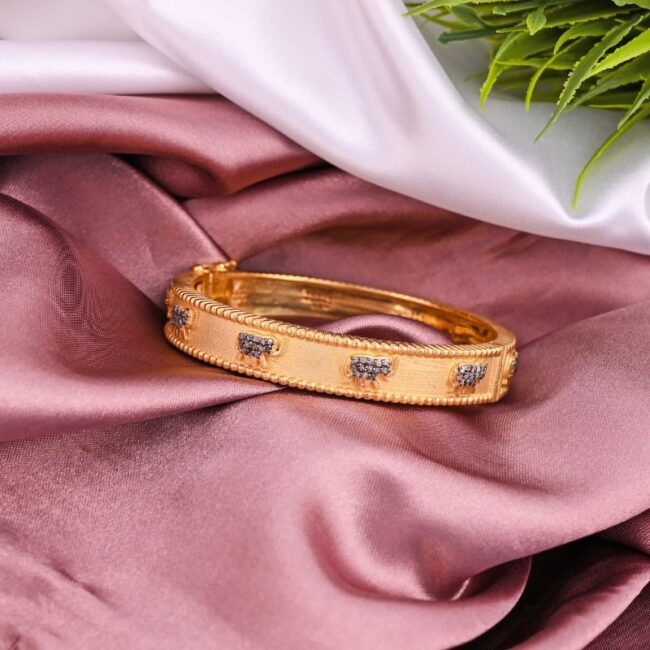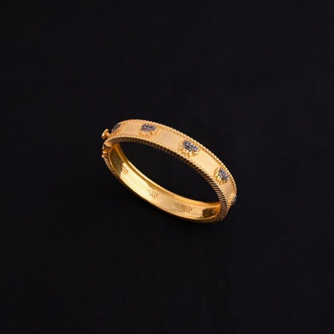 This elegant gold bracelet is adorned with a charming elephant motif, symbolizing prosperity and abundance. The intricate design features sparkling diamonds, enhancing the beauty of elephant. The bracelet is perfect for any occasion, whether it’s a special celebration or everyday wear.