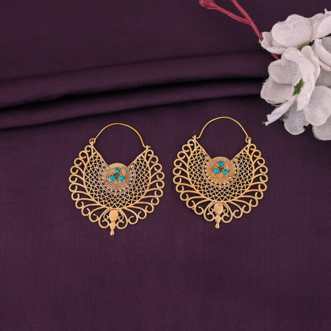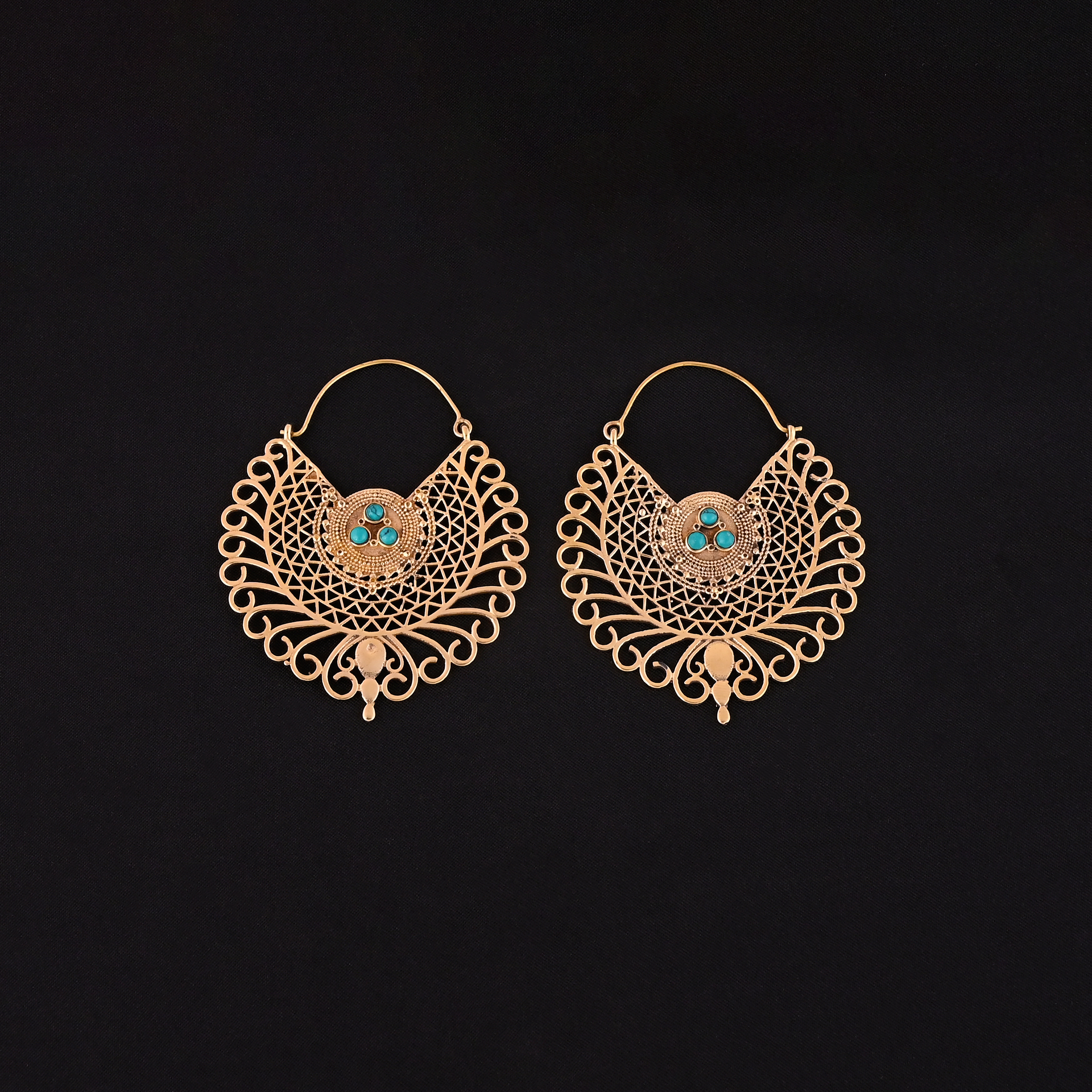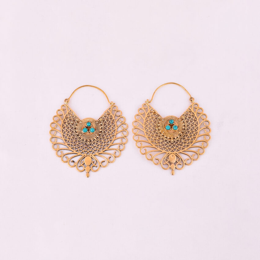 Intricately detailed and masterfully handcrafted, each pair balances bold design with natural beauty. The striking contrast between the gold and turquoise creates a rich, exotic flair—perfect for festivals, evening wear, or elevating a simple outfit with a royal touch.