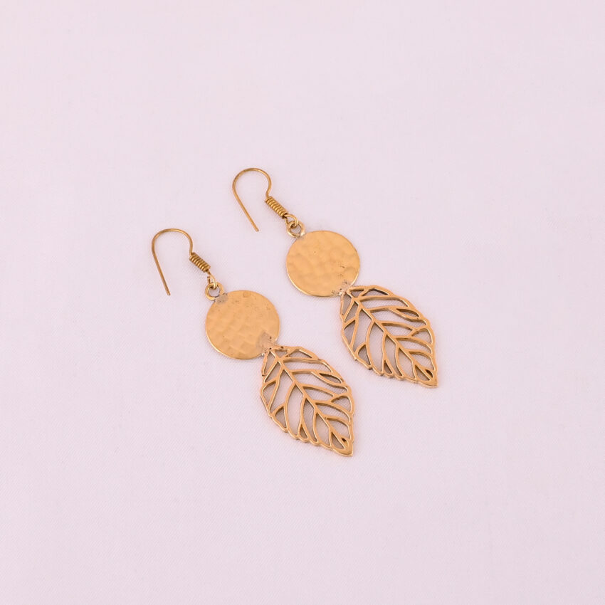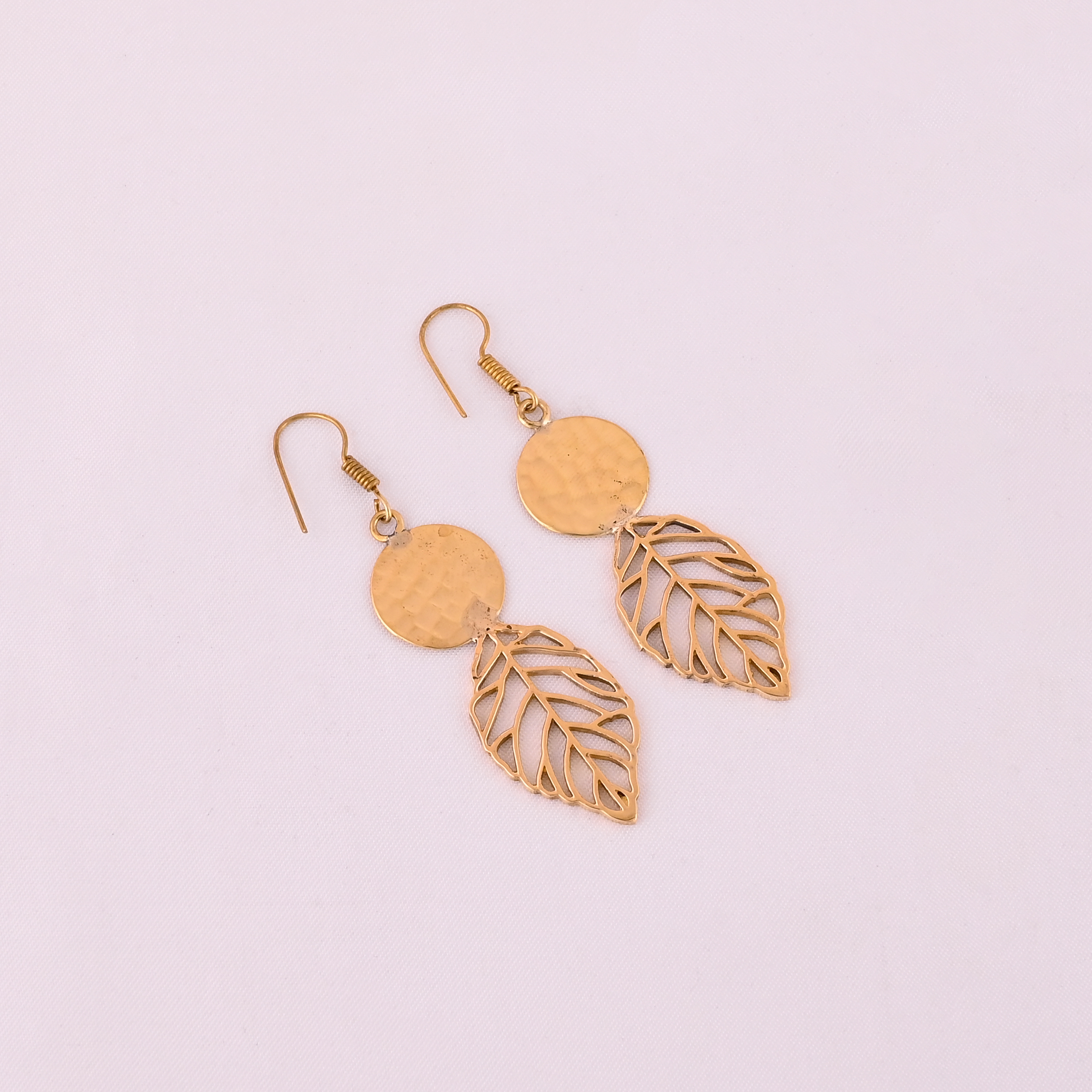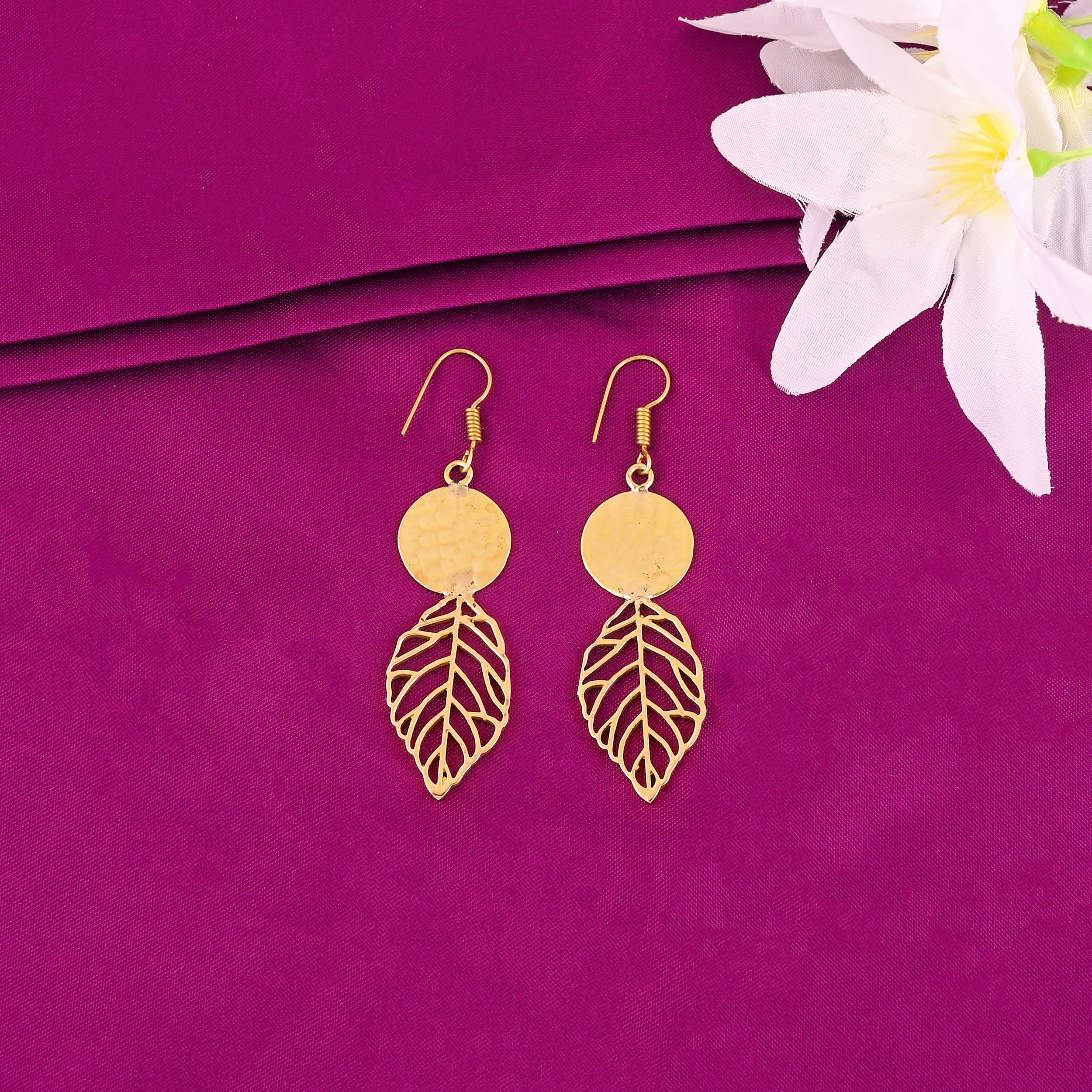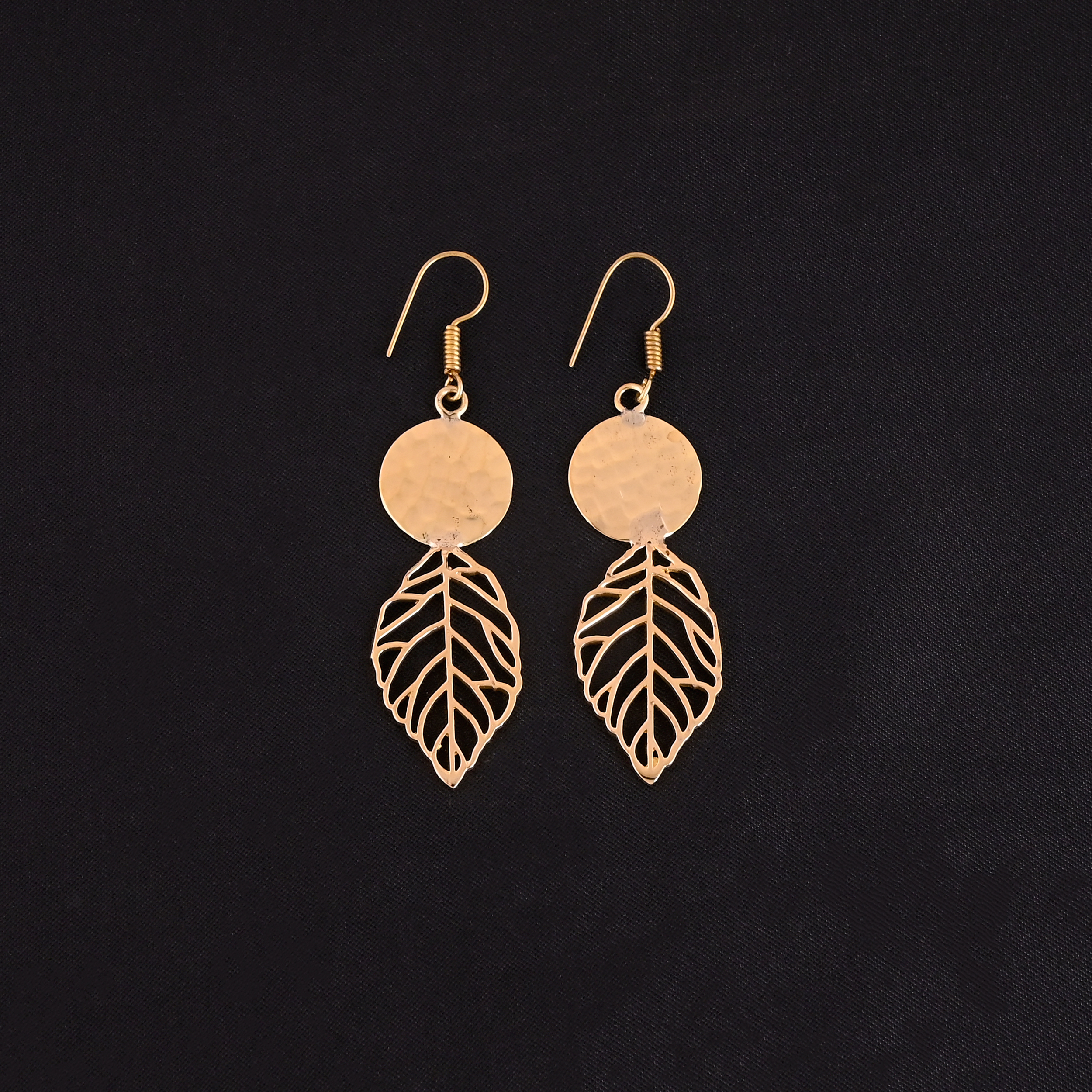 Bold and earthy, these Gold Metal Tribal Leaf Earrings bring together tribal artistry and natural elegance in one striking accessory. Designed in a stylized leaf silhouette, these earrings feature intricate engravings and a hand-crafted feel, inspired by traditional tribal motifs and ancient metalwork.
