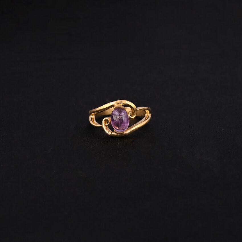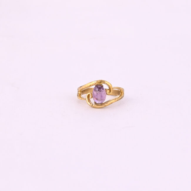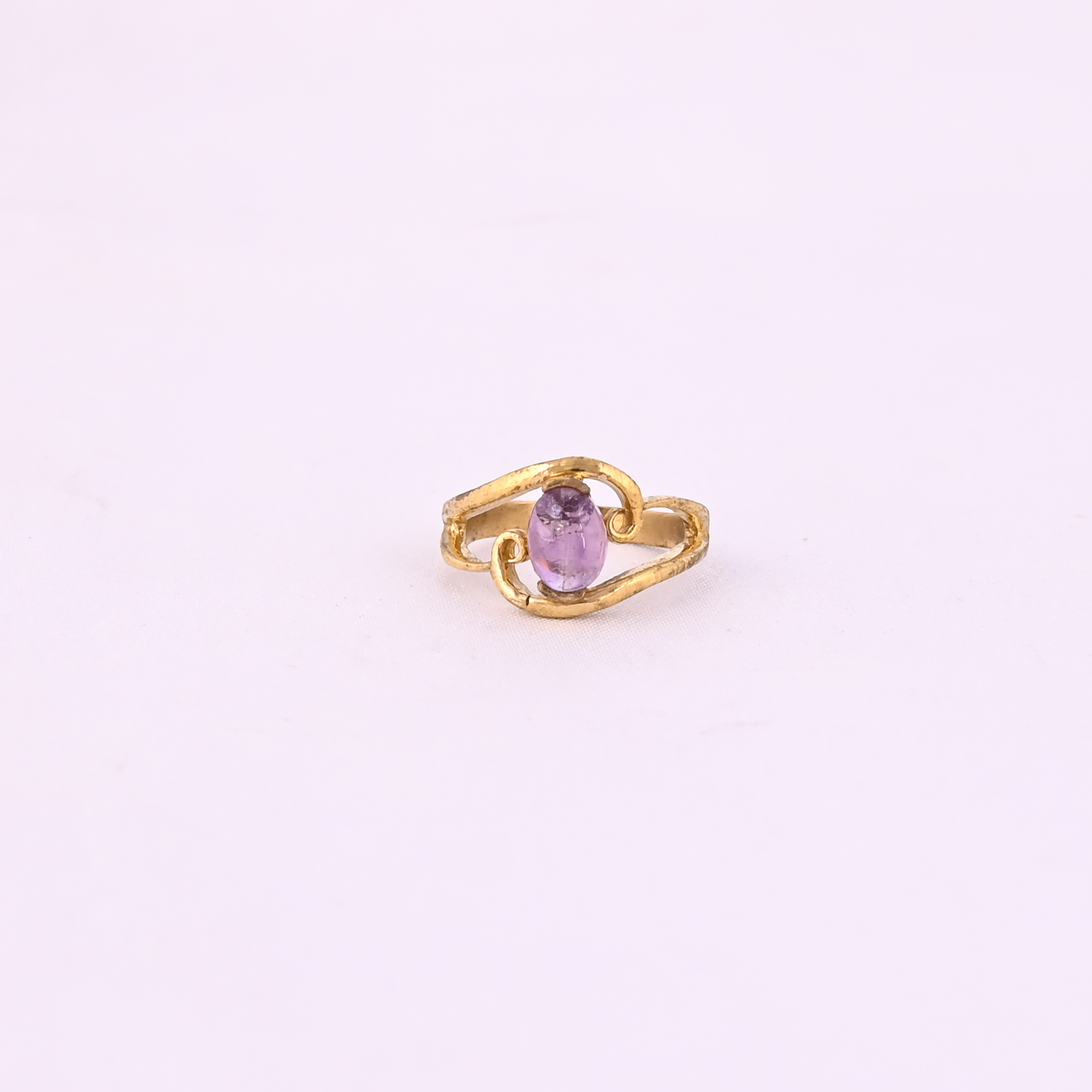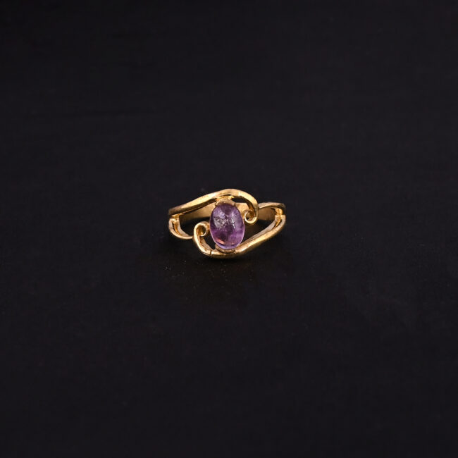 Gold-Plated Amethyst Double Loop Ring with Purple Stone-This exquisite vintage ring features a delicate gold band artistically crafted with graceful, swirling details that frame a stunning oval-shaped amethyst gemstone at its center. The amethyst showcases a beautiful purple hue with natural inclusions that add character and charm. The ring’s unique design blends classic elegance with a touch of artistic flair, making it a perfect accessory for both everyday wear and special occasions.