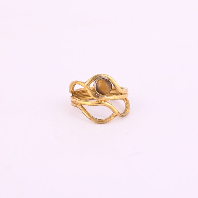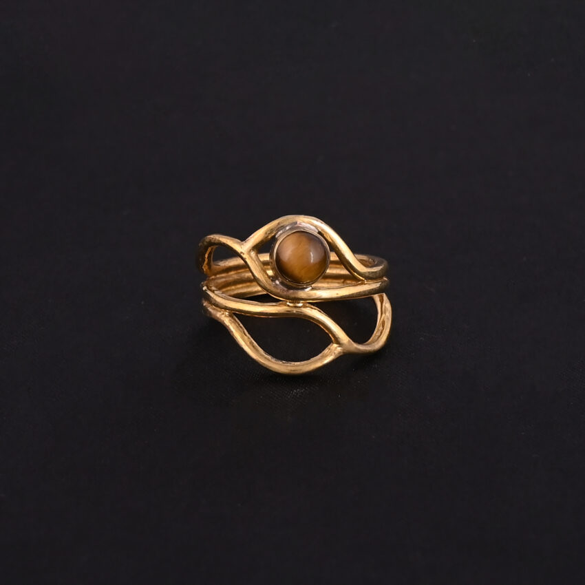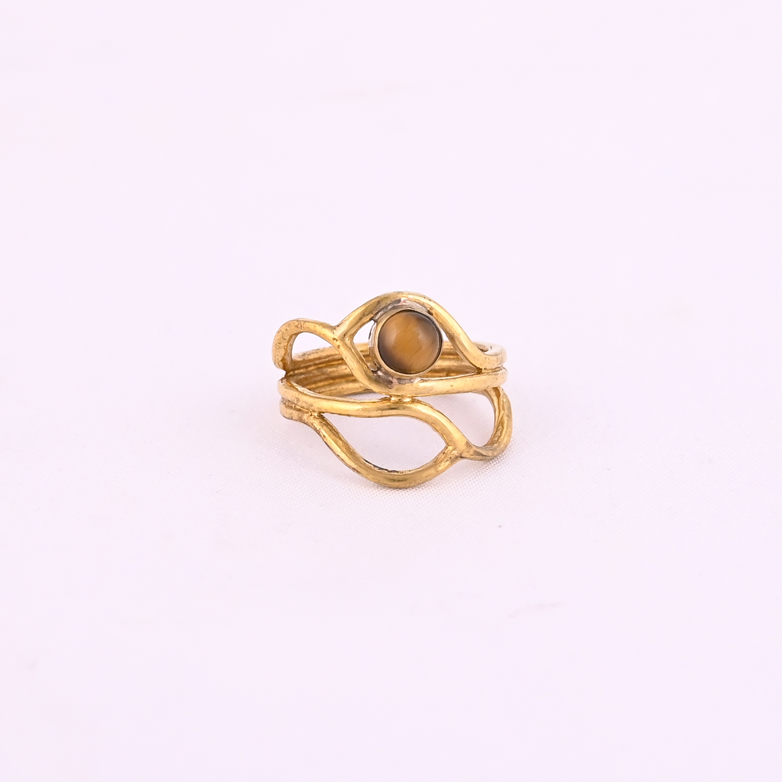 Bold gold-tone ring featuring an abstract wave design and a captivating tiger eye stone at the center — a perfect statement piece with a touch of earthy charm.