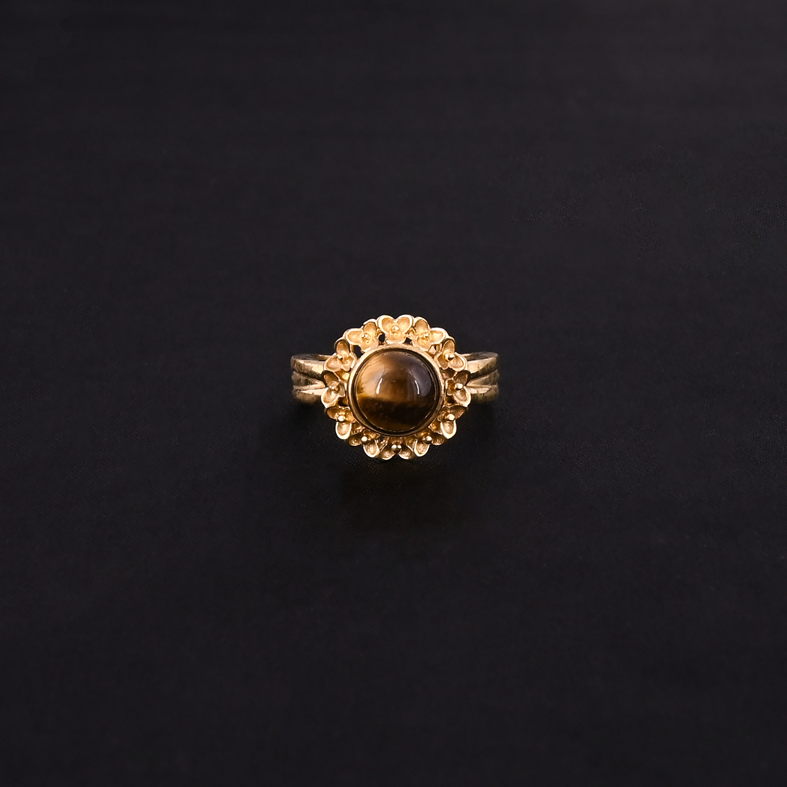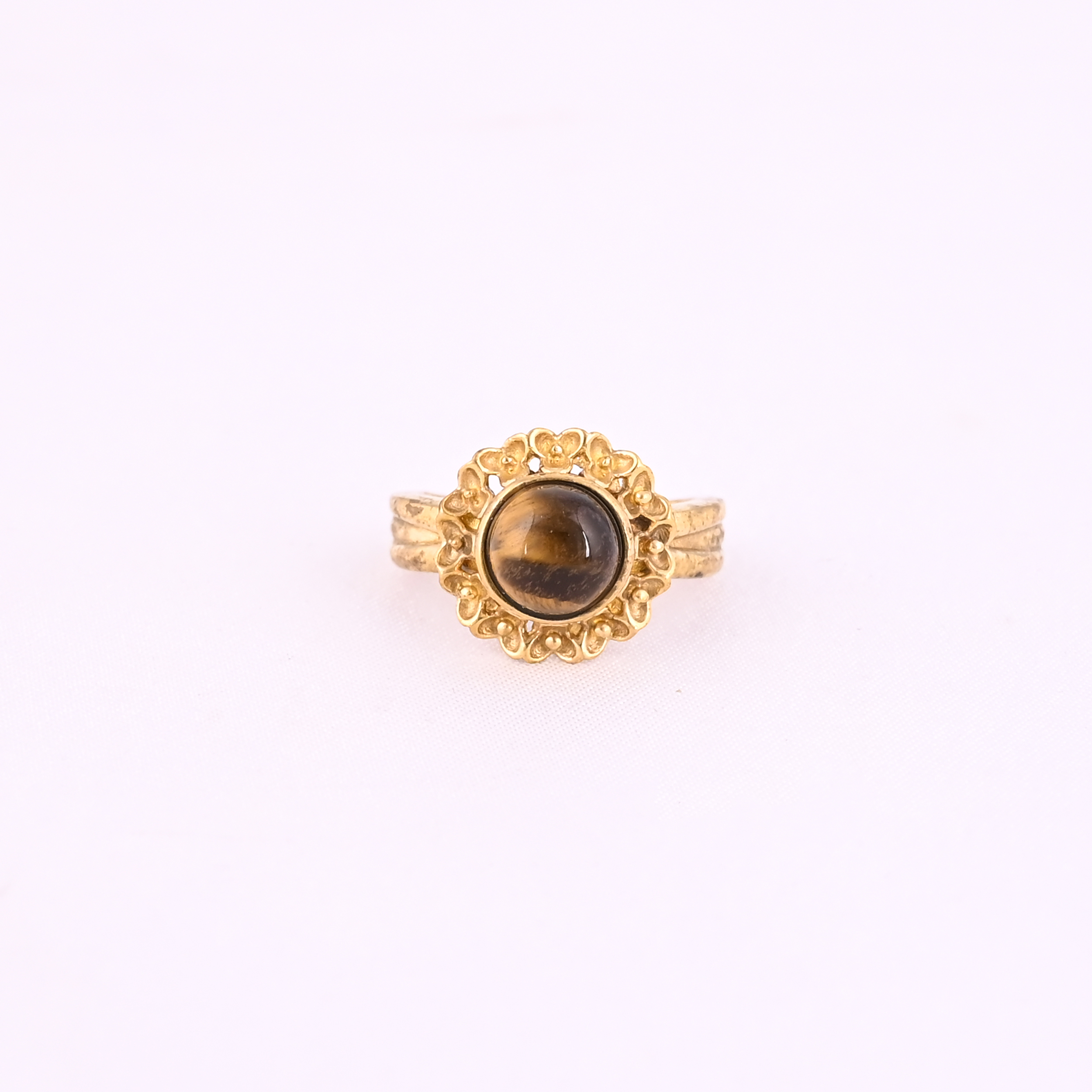 Gold-tone ring featuring a polished round tiger’s eye stone set in a delicate floral bezel with a textured band. A perfect blend of vintage charm and natural beauty.