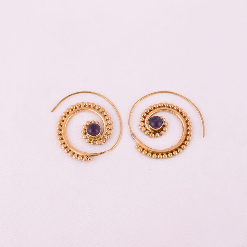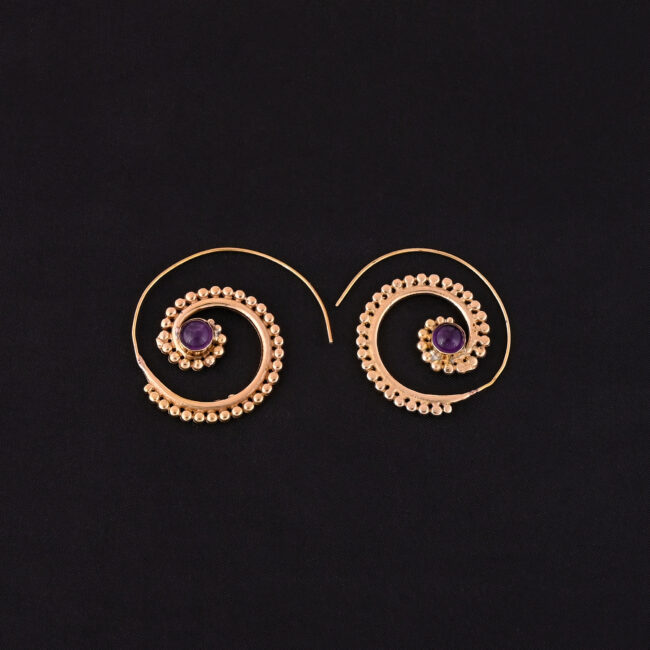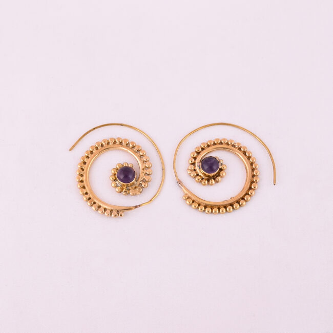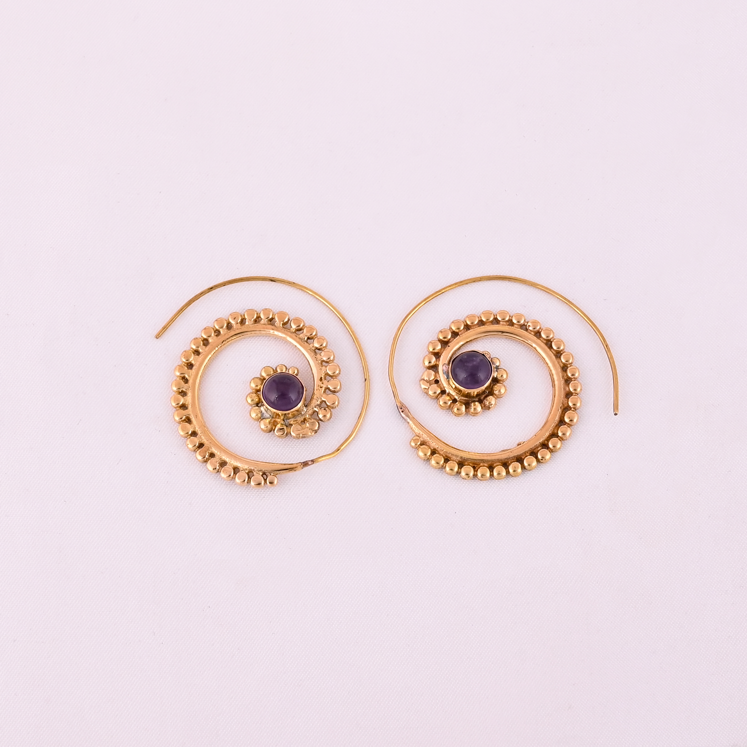 Channel cosmic energy and bohemian charm with these Gold Plated Spiral Earrings, adorned with a central purple stone or bead that adds a pop of mystical color. The spiral motif—symbolizing growth, transformation, and harmony—is beautifully handcrafted in a radiant gold-plated finish, giving the earrings a warm and elegant glow.