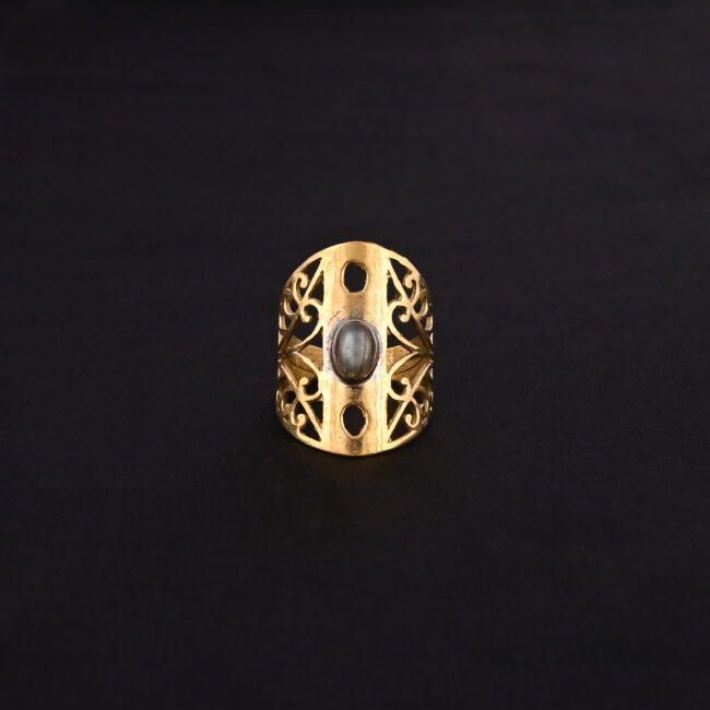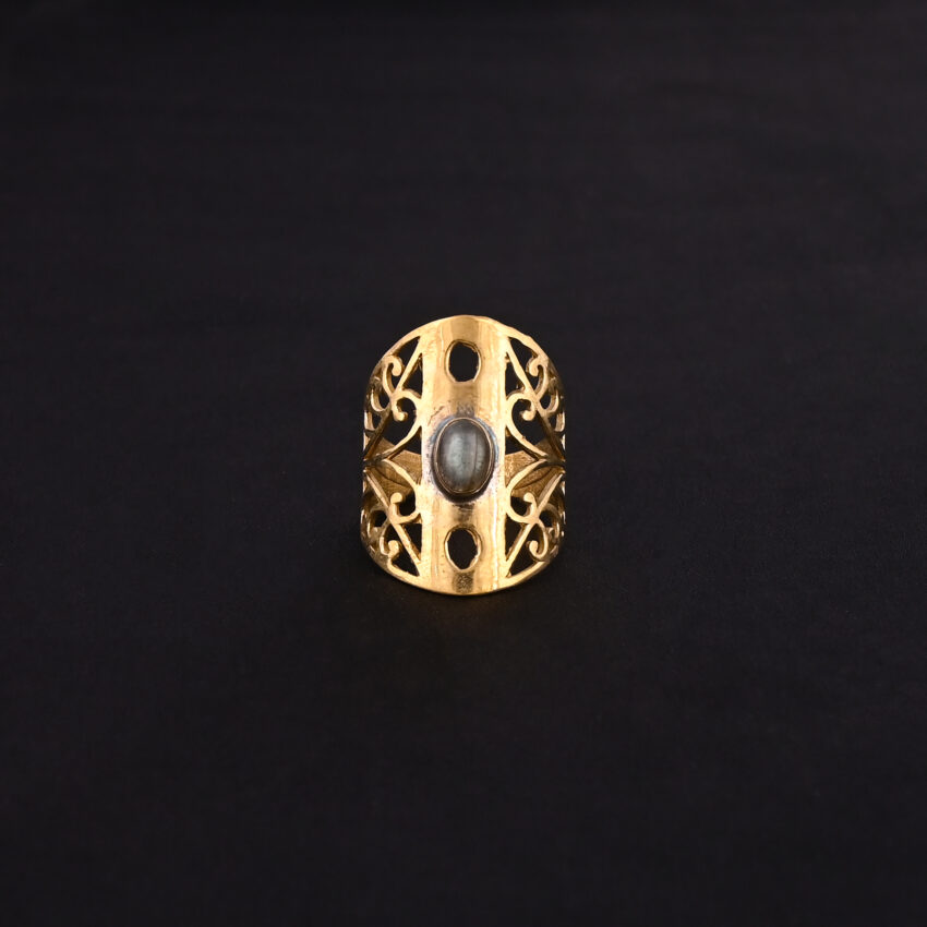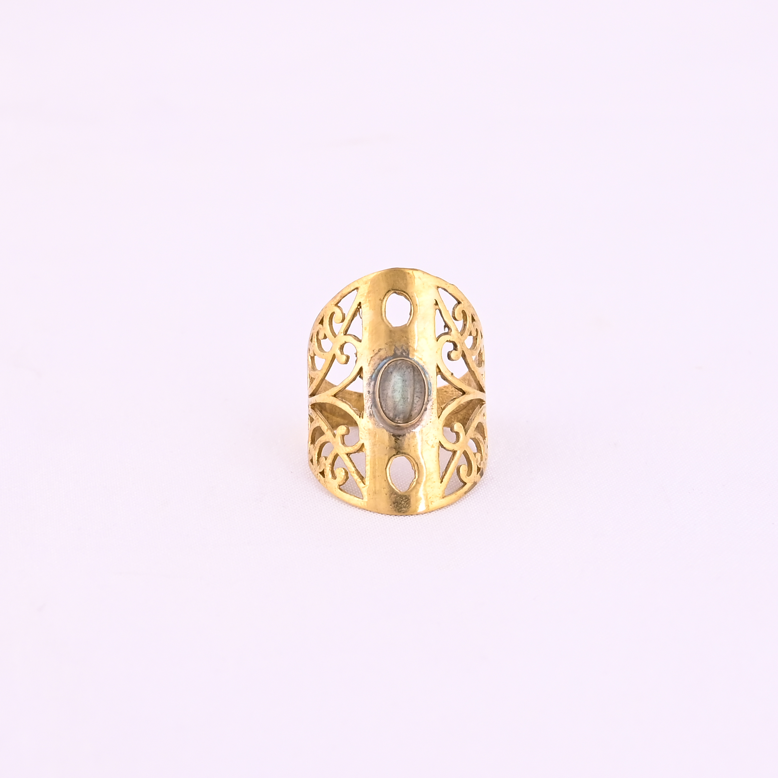 Intricate Filigree Gold Plated Ring wih Center Stone-This stunning vintage ring features an intricate gold filigree design, showcasing delicate scrollwork that wraps gracefully around the finger. At the center, a beautifully set oval gemstone adds a subtle touch of color and sophistication. The wide band design offers both comfort and a bold statement, making it a perfect accessory for both everyday wear and special occasions.