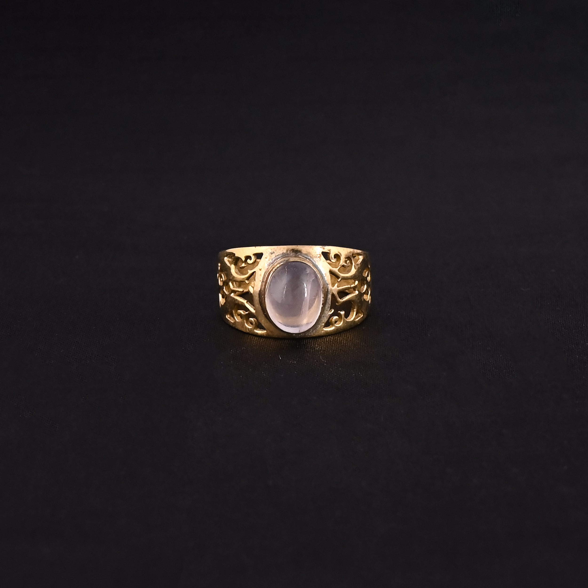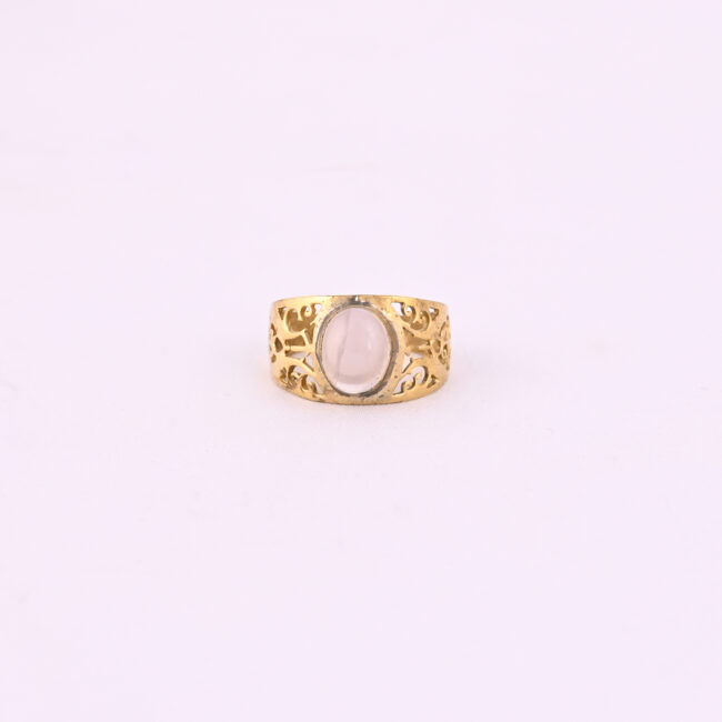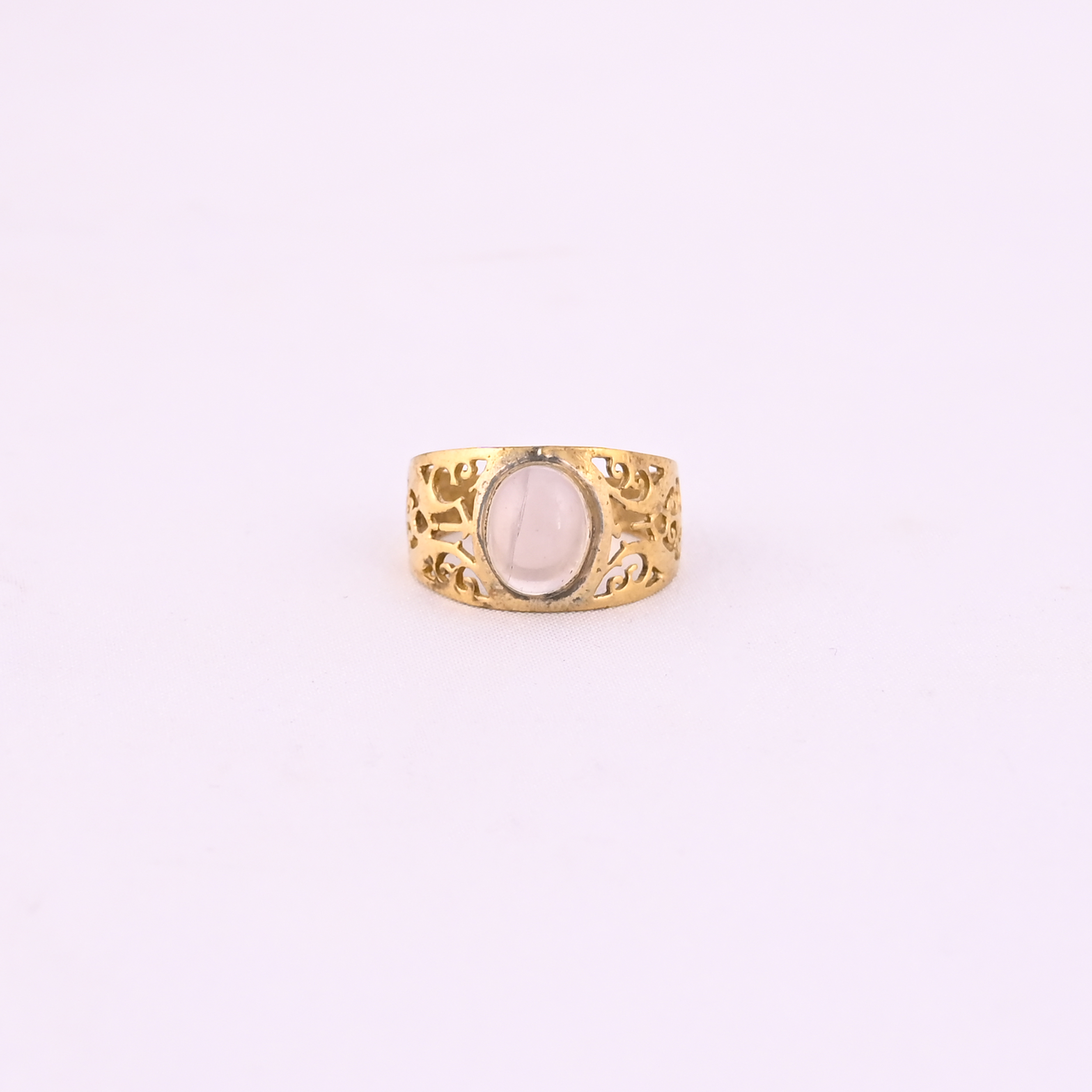 Lavender Stone Filigree Gold-Plated Ring-Add a touch of timeless elegance to your jewelry collection with this stunning gold ring featuring a beautiful oval rose quartz gemstone. The wide band showcases intricate filigree cut-out patterns that add delicate detail and vintage charm.