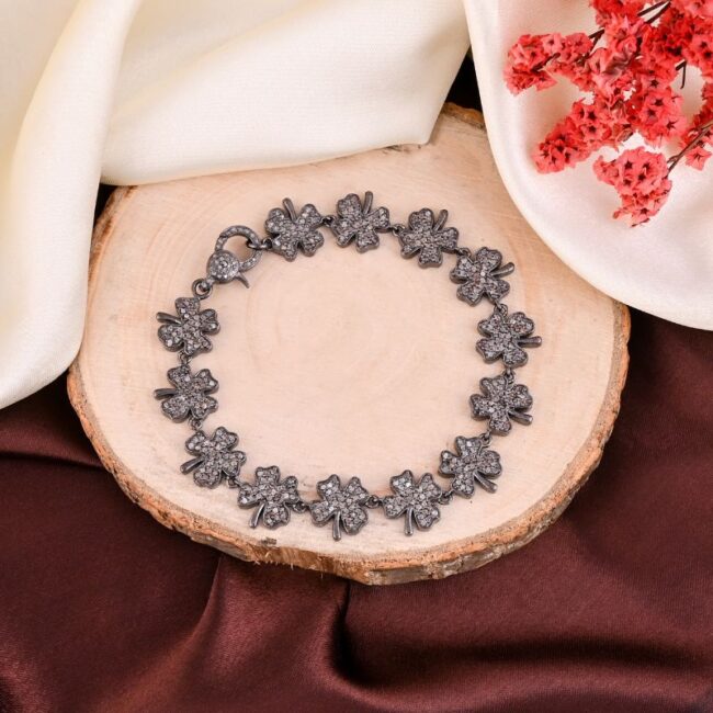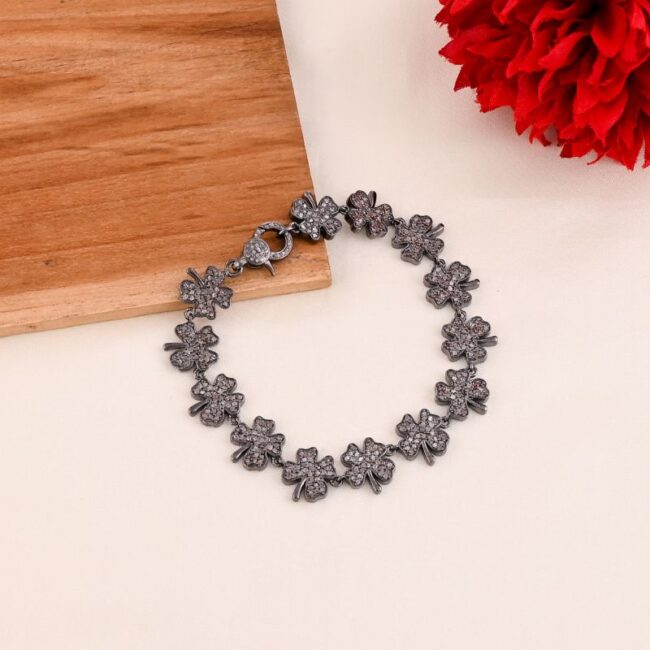 This enchanting cloverleaf bracelet is a captivating piece of jewelry that blends timeless elegance with a touch of whimsy. The bracelet features a delicate chain of interconnected cloverleaf pendants, each meticulously adorned with sparkling diamonds. The intricate design and luxurious materials make it a versatile accessory that can be dressed up or down.