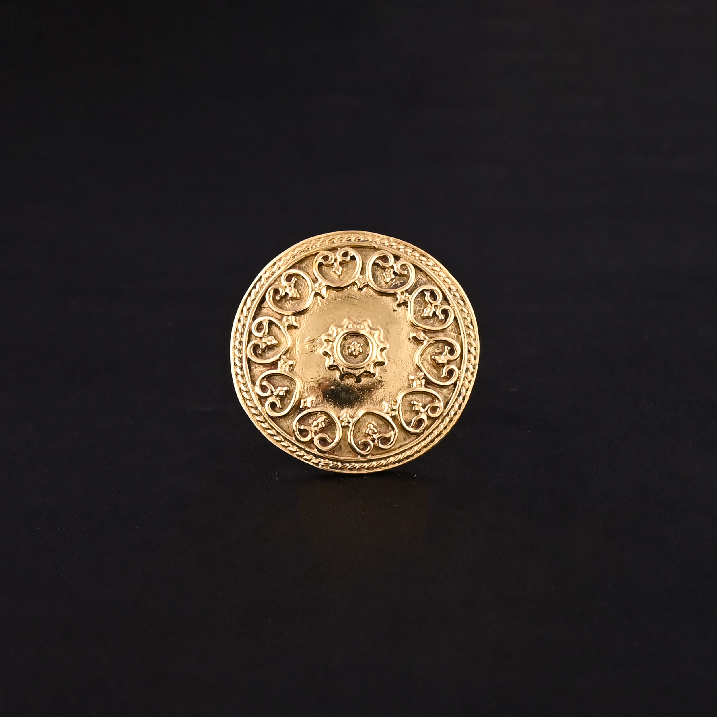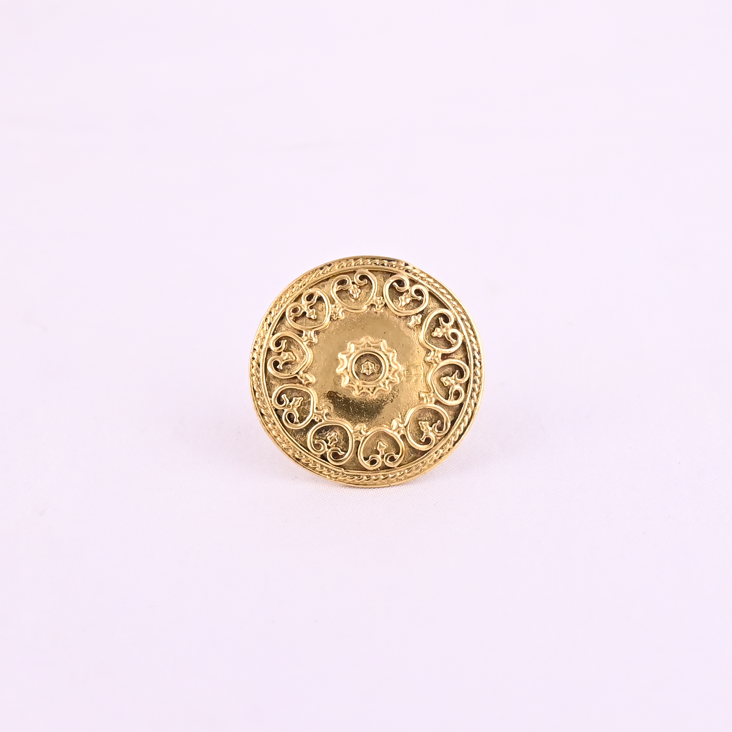 Mandala Inspired Gold Plated Ring with Beautiful Heart Shaped Details-This stunning ring features a mandala-inspired design with intricate patterns and beautiful heart- shaped details.The gold plated finish adds a touch of elegance and sophistication,making it perfect for everyday wear or special occasions