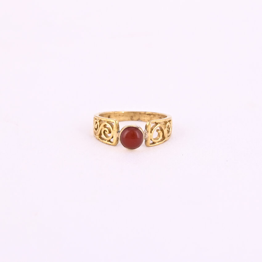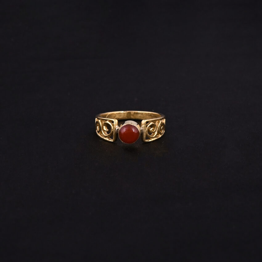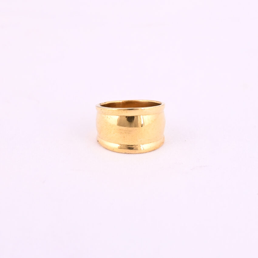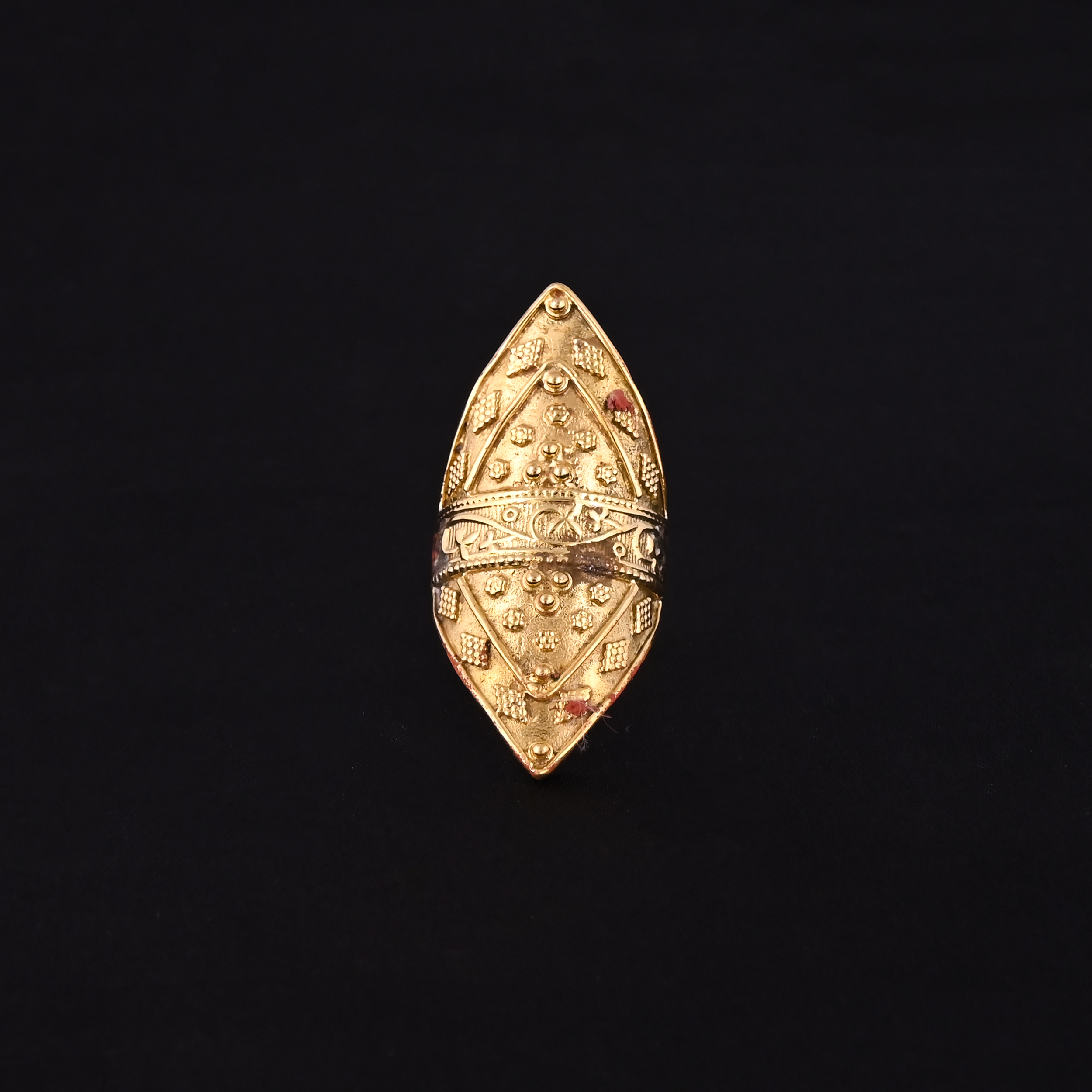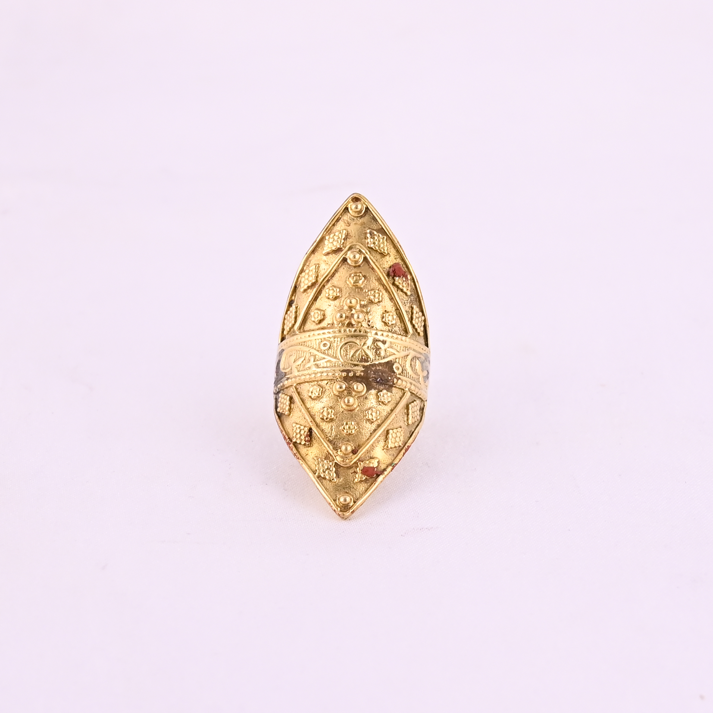 Vintage-style gold-toned ring with intricate embossed patterns and a bold, elongated marquise shape.