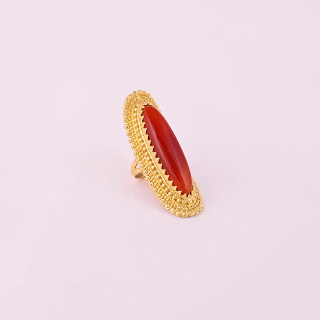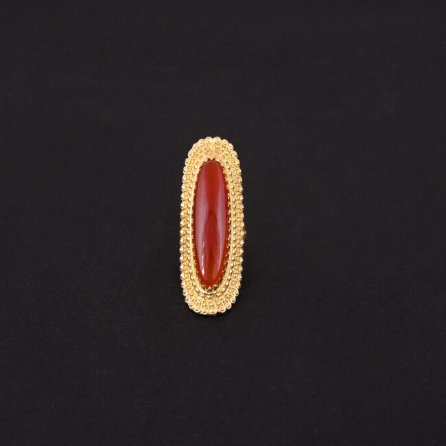 Red Onyx Oval Ring – Elegant and captivating, this ring showcases a smooth, polished red onyx gemstone in a classic oval cut. The rich crimson hue of the stone exudes warmth and sophistication, while its sleek setting highlights the gem’s natural beauty.