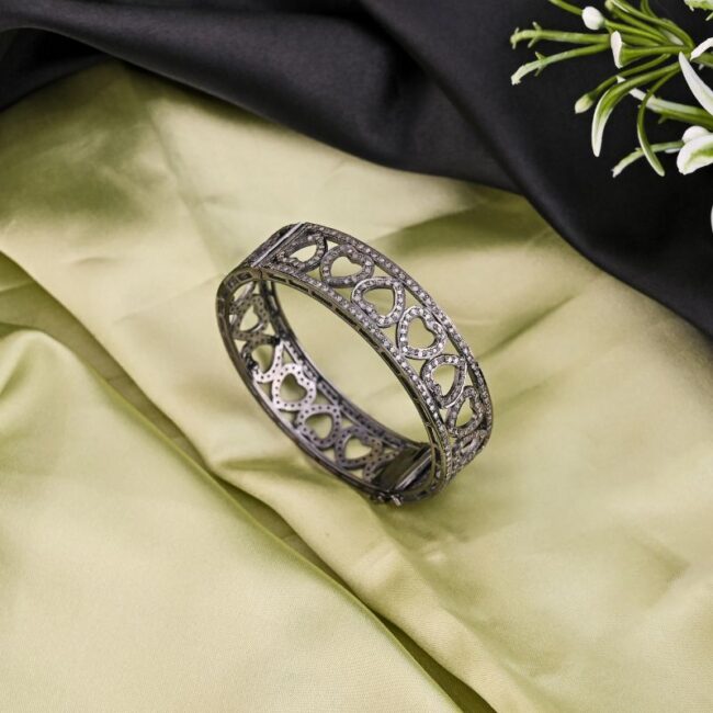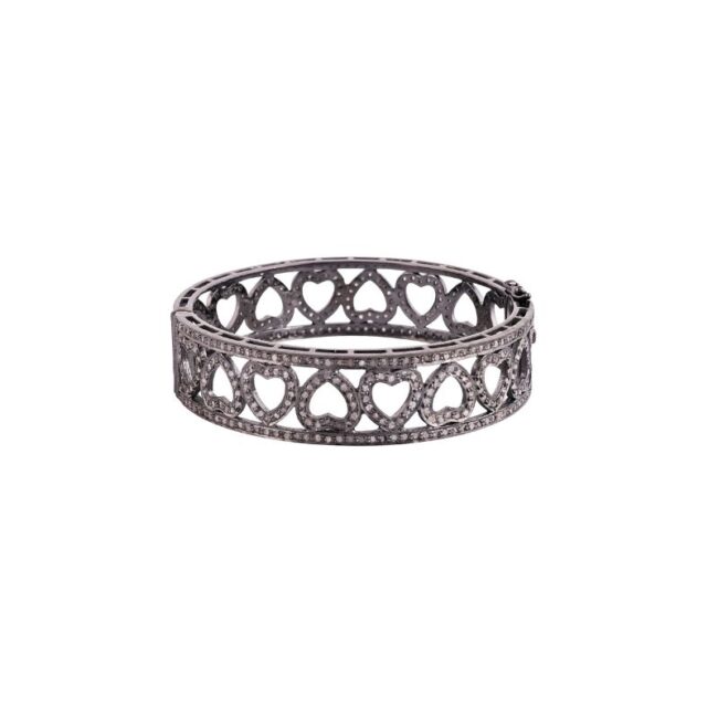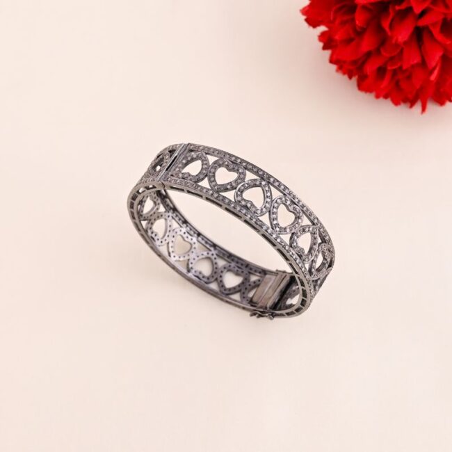 This elegant silver bangle is adorned with a captivating heart-shaped design, symbolizing love and romance. The intricate cutout work creates a mesmerizing visual effect, while the sparkling diamonds add a touch of glamour and sophistication. The bangle is perfect for any occasion, whether it’s a special celebration or everyday wear.