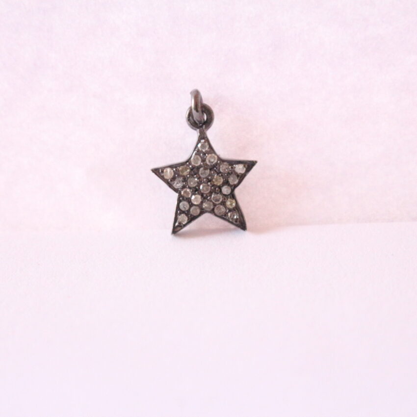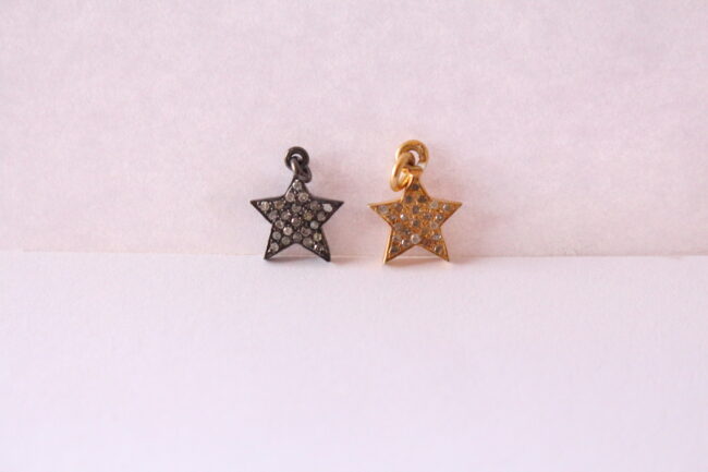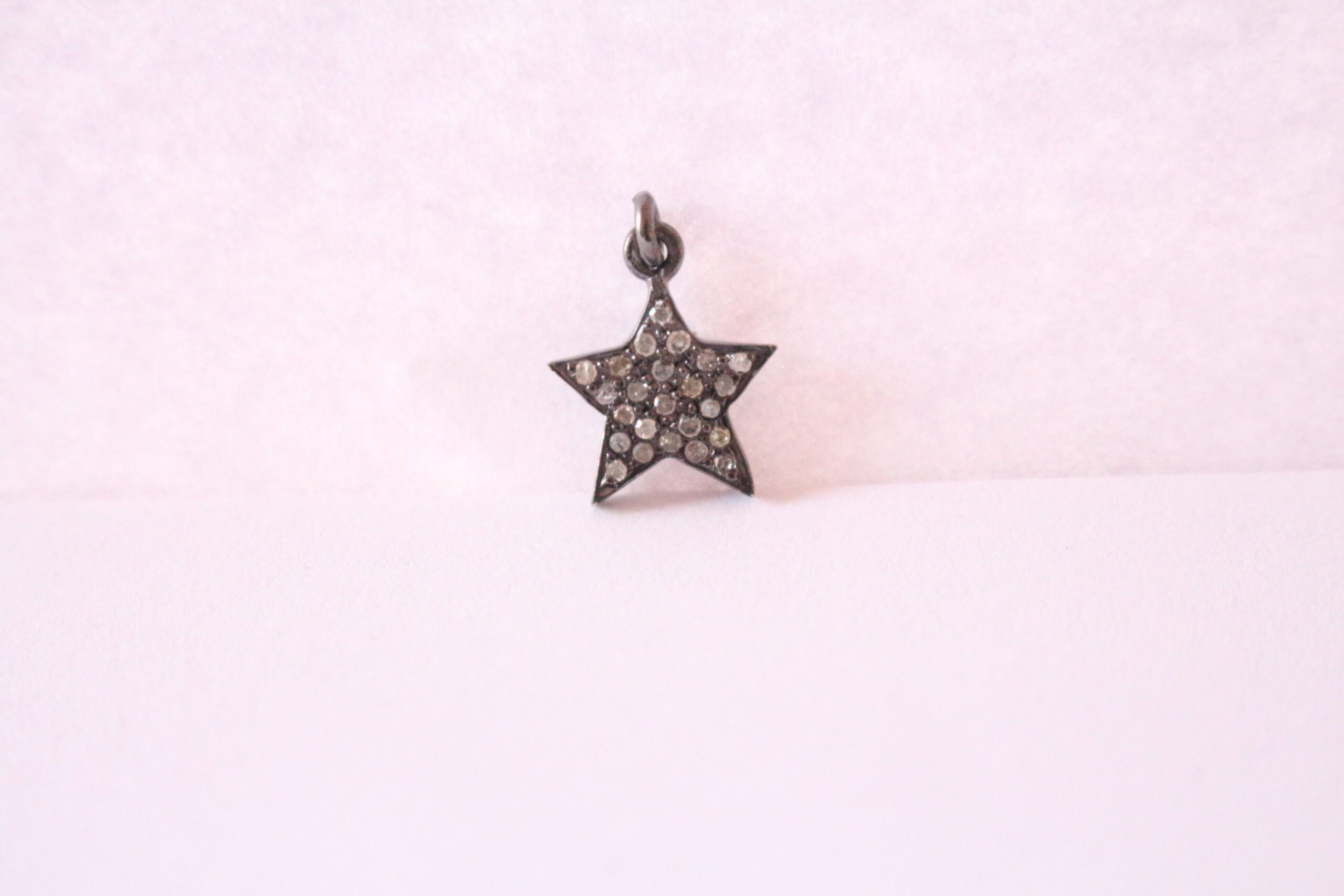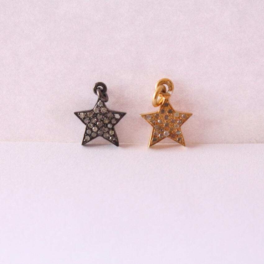 This celestial diamond star charm is the perfect way to add a touch of magic to your look. The classic star shape is adorned with sparkling diamonds, creating a dreamy and ethereal piece. The charm is crafted from high-quality gold and features a row of brilliant-cut diamonds that encircle the star shape.