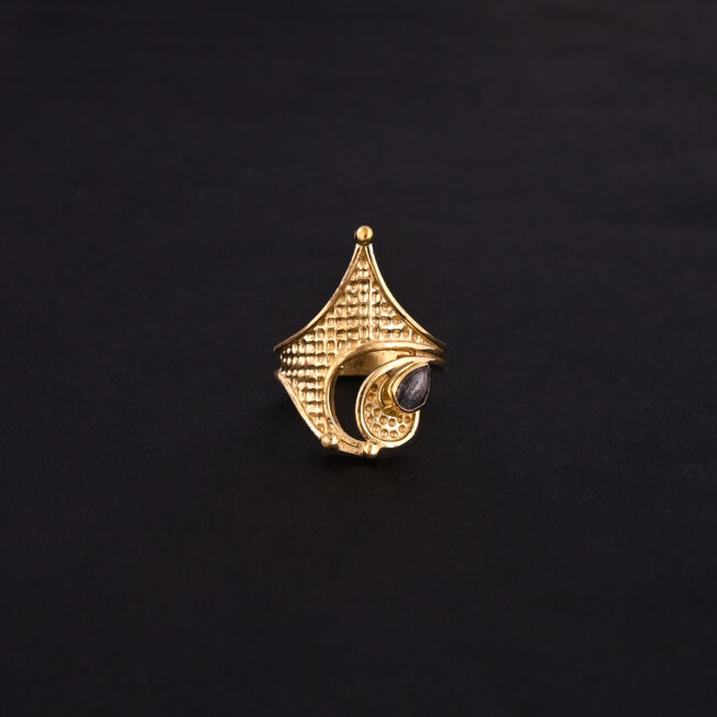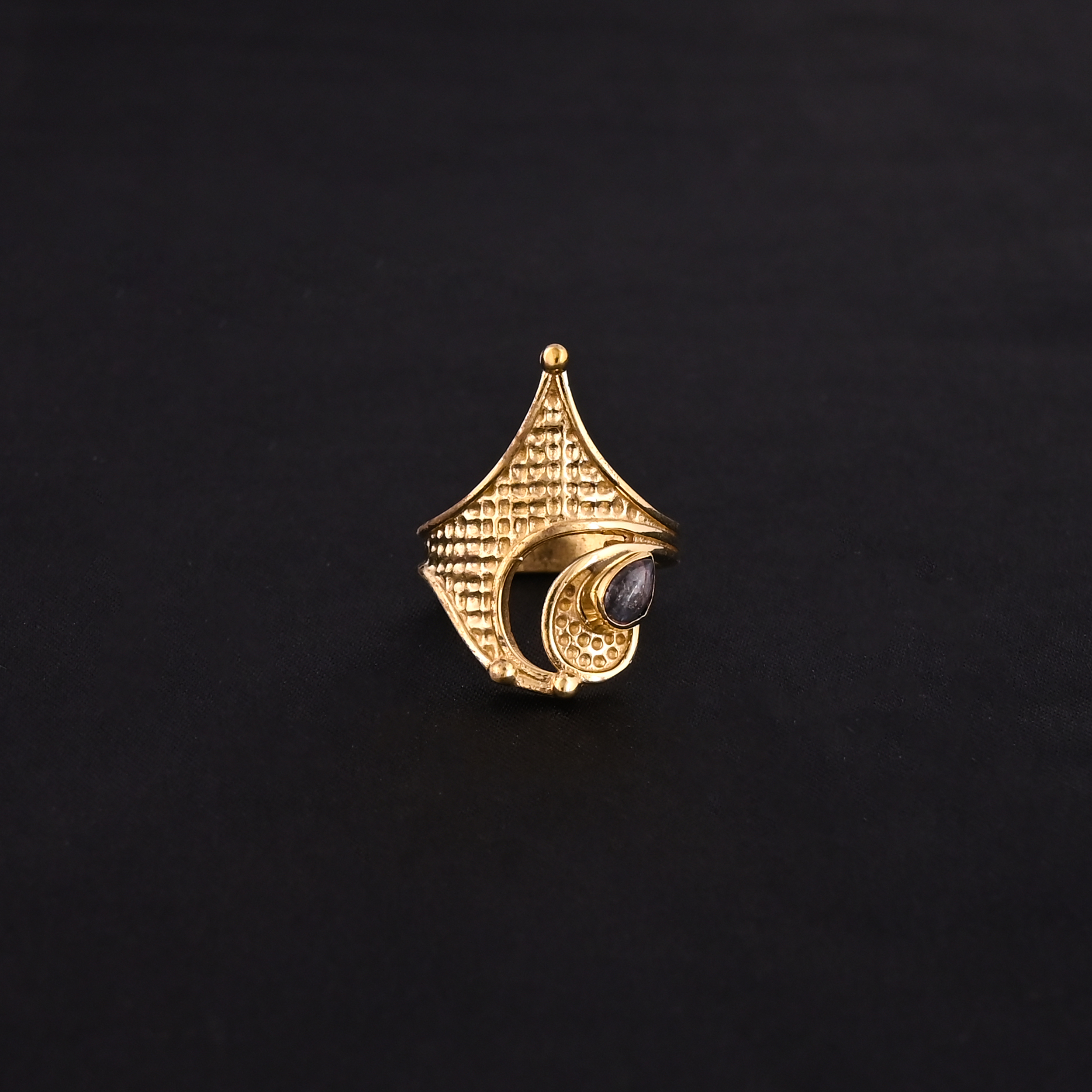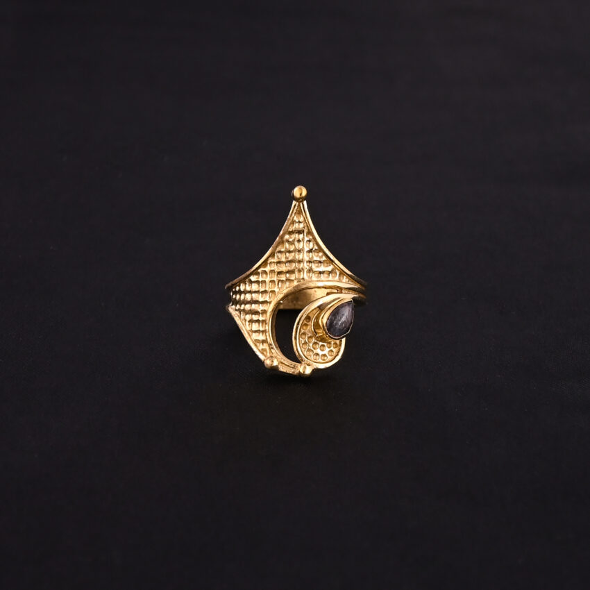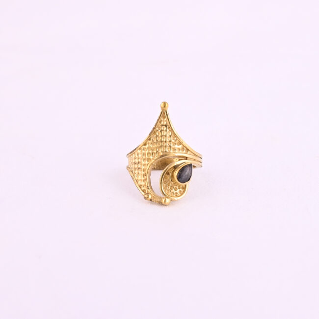 Bold and artistic handcrafted brass ring featuring a geometric design with a crescent motif and black stone accent. Finished in an antique gold tone for a timeless, statement look.